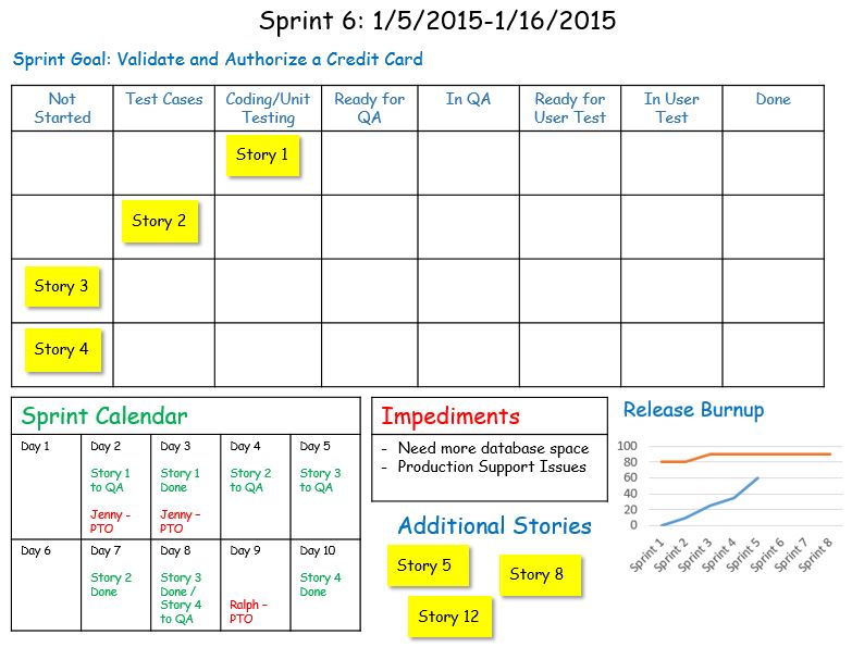 A note for teams that use online/electronic Scrum or Kanban boards: additional information such as the PTO calendar, Impediments and release burnup can be captured in story cards and placed in a column dedicated to that background information. The sprint calendar can be captured by putting Due Dates on each electronic story card. On a physical or electronic board, the story cards can contain as much information as the team finds helpful. Typically the story number, title, and number of story points are included.